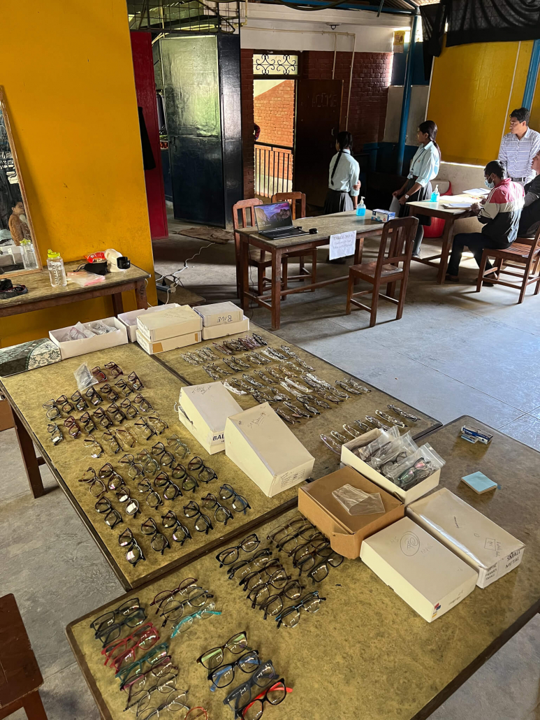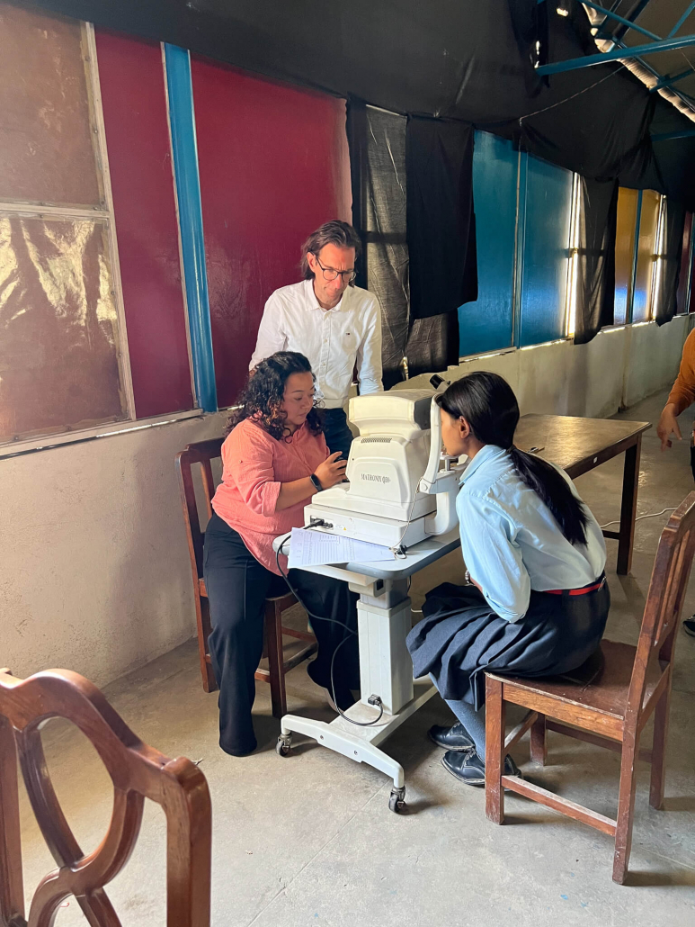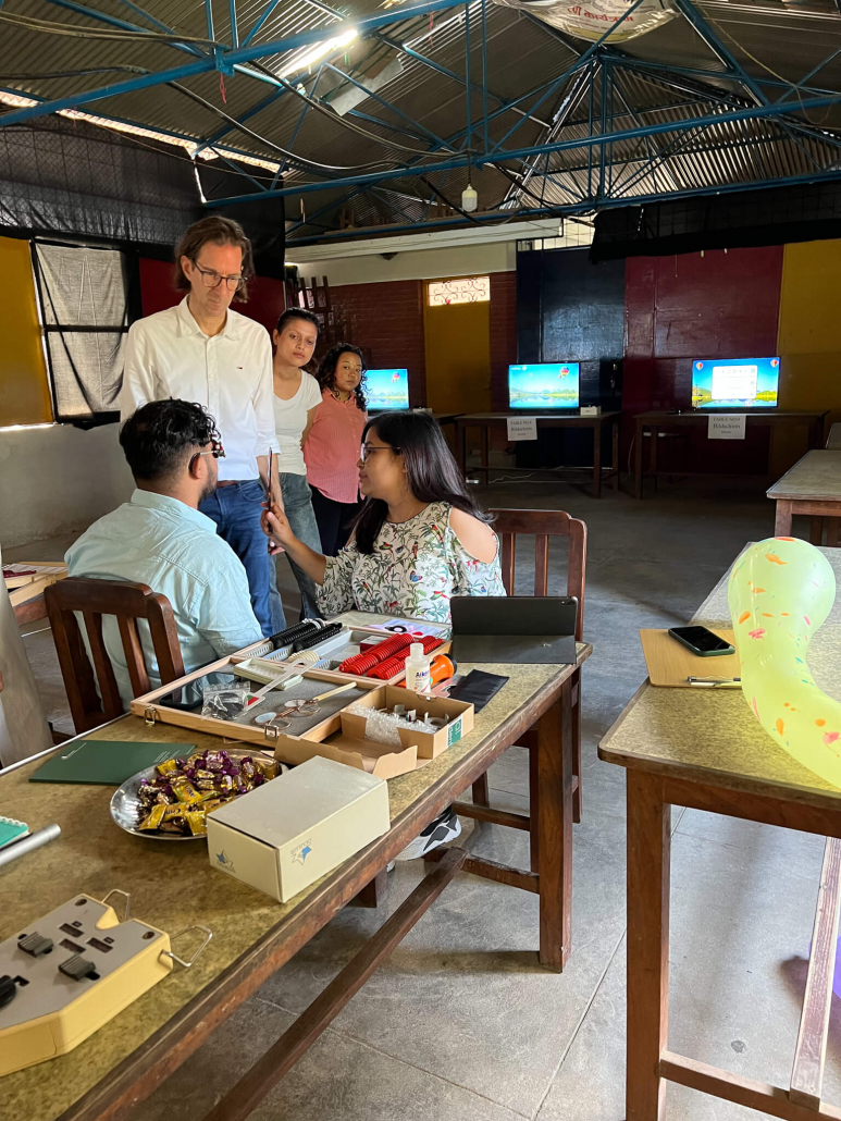 Am ersten Tag haben wir vor allem die ganz kleinen Kinder und die Jüngeren untersucht. Hier gab es wenig Auffälligkeiten. Die meisten der kleinen Kinder hatten einen guten Visus (Sehleistung) und brauchten keine Brille. Ausnahmen gab es natürlich und auch ein paar kleine Kinder haben Brillen bekommen. Wir haben die Stationen so eingeteilt, dass Asu, Silu und Rokshan (alles Optometristen) die Augenprüfung durchgeführt haben. Barksha hat den Autorefraktometer bedient und Volker hat alle Brillen angepasst, den Pupillenabstand gemessen und an allen Stellen ausgeholfen bzw. beraten, wenn es Rückfragen gab.