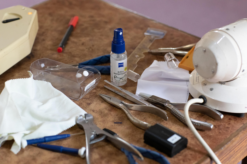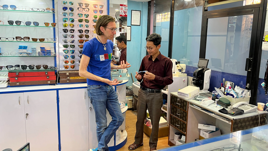 Nach den umfassenden Messungen lassen wir die Brillengläser von unserem Augenoptiker anfertigen. Mit ihm arbeiten wir inzwischen schon länger zusammen. Er hat inzwischen viel dazu gelernt und ist in der Lage nach unseren Vorgaben gute Brillen zu liefern. Die Fassungen bringen wir zum großen Teil aus Deutschland mit, da die Qualität der Fassungen erheblich höher ist.